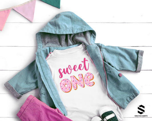 Sweet One Pink Donuts Birthday Shirt with Permanent Print on Toddler Onesie