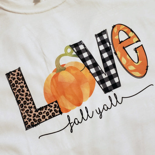 Love Fall Yall with Pumpkins, Leopard Print, Plaid and Leaves Print T-Shirt