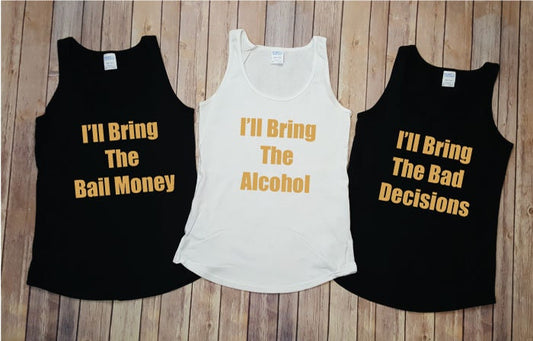 I'll Bring the Alcohol - I'll Bring the Bad Decisions - Block Font - Bridesmaids Bachelorette Tanks