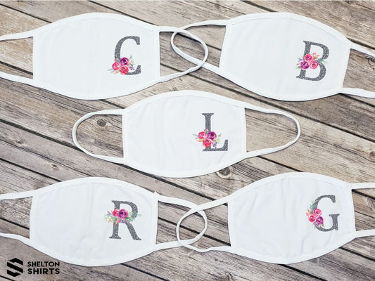 Watercolor Floral with Glitter Letter Printed Bachelorette Party or Birthday Party Face Mask - Set of 5 Party Masks