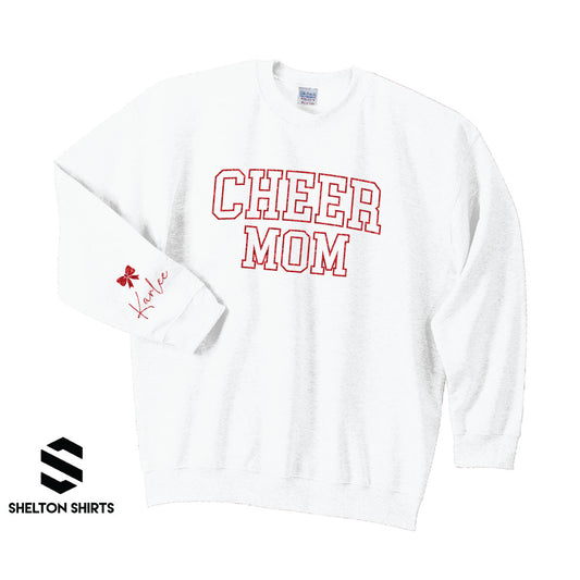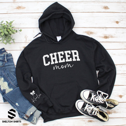 Glitter Cheer Mom with Bow and Name on Sleeve Sweatshirt, Hoodie or T-shirt