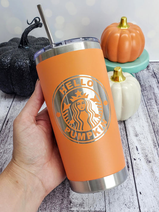 Engraved Hello Pumpkin Starbucks Logo on Grande Orange Stainless Tumbler