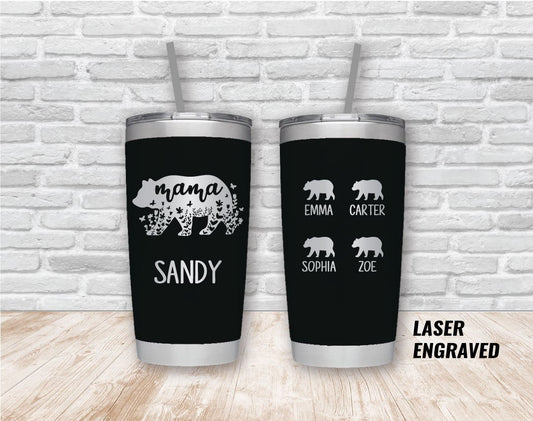 Mama Bear with Flowers and Baby Bears with Kids Names Engraved on Back