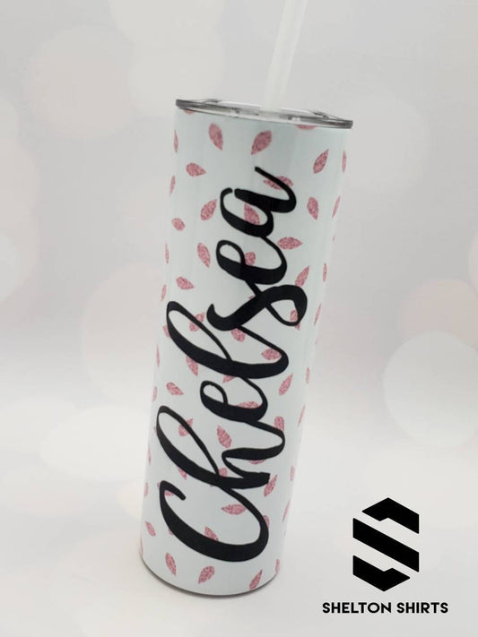 Personalized Script Name and Glitter Pink Petals Tumbler