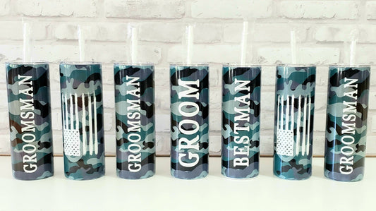 Camo Tumbler with Name on the Front and Distressed Flag on the Back