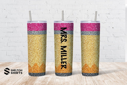 Printed glitter pencil custom teacher name tumbler