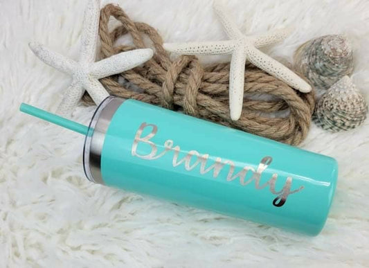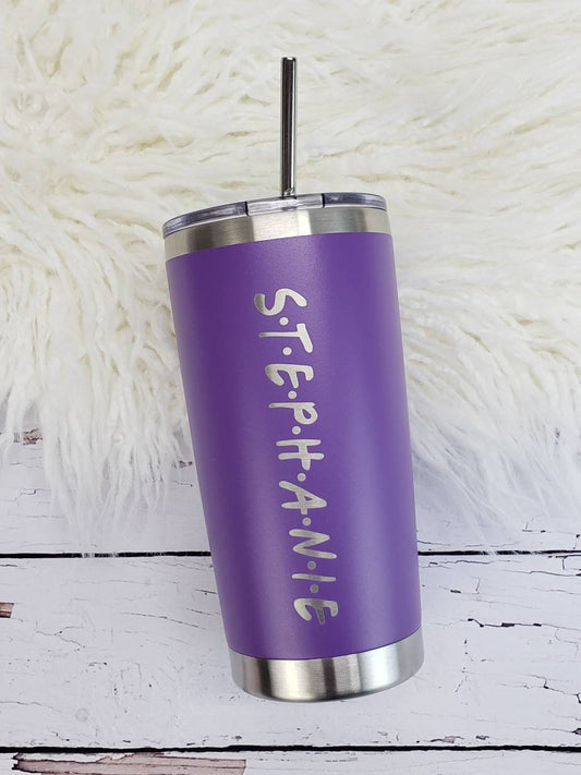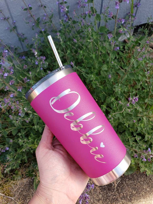 Laser Engraved Script Name Tumbler - 20oz Hot Tumbler with Silver Stainless Straw