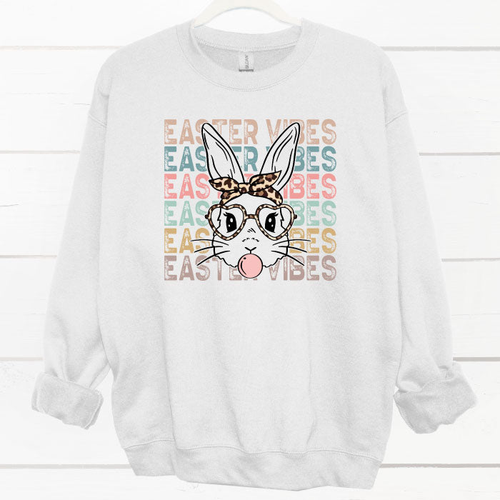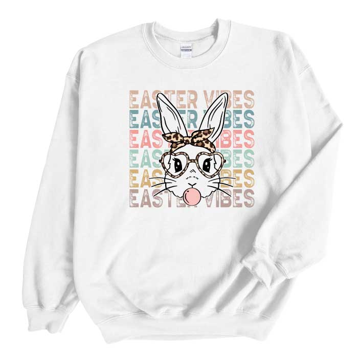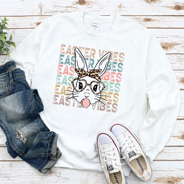 Hop into spring with this festive Easter sweatshirt. Featuring a colorful graphic of a cute bunny rabbit wearing glasses surrounded by Easter Vibes wording, this sweatshirt captures the fun spirit of the holiday. Made from ultra-soft cotton, it's comfortable enough to wear all day as you hunt for eggs and enjoy family celebrations.