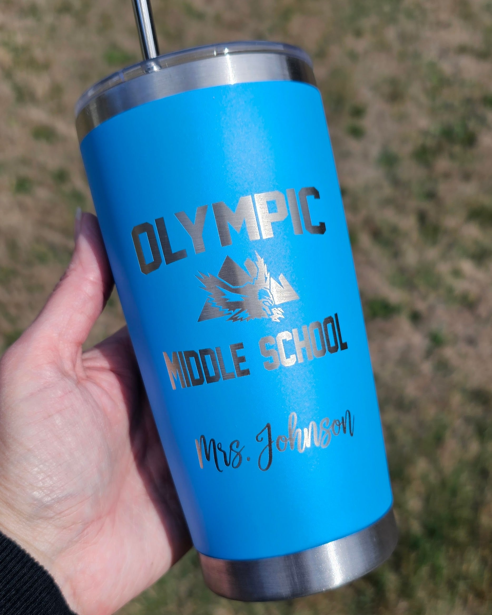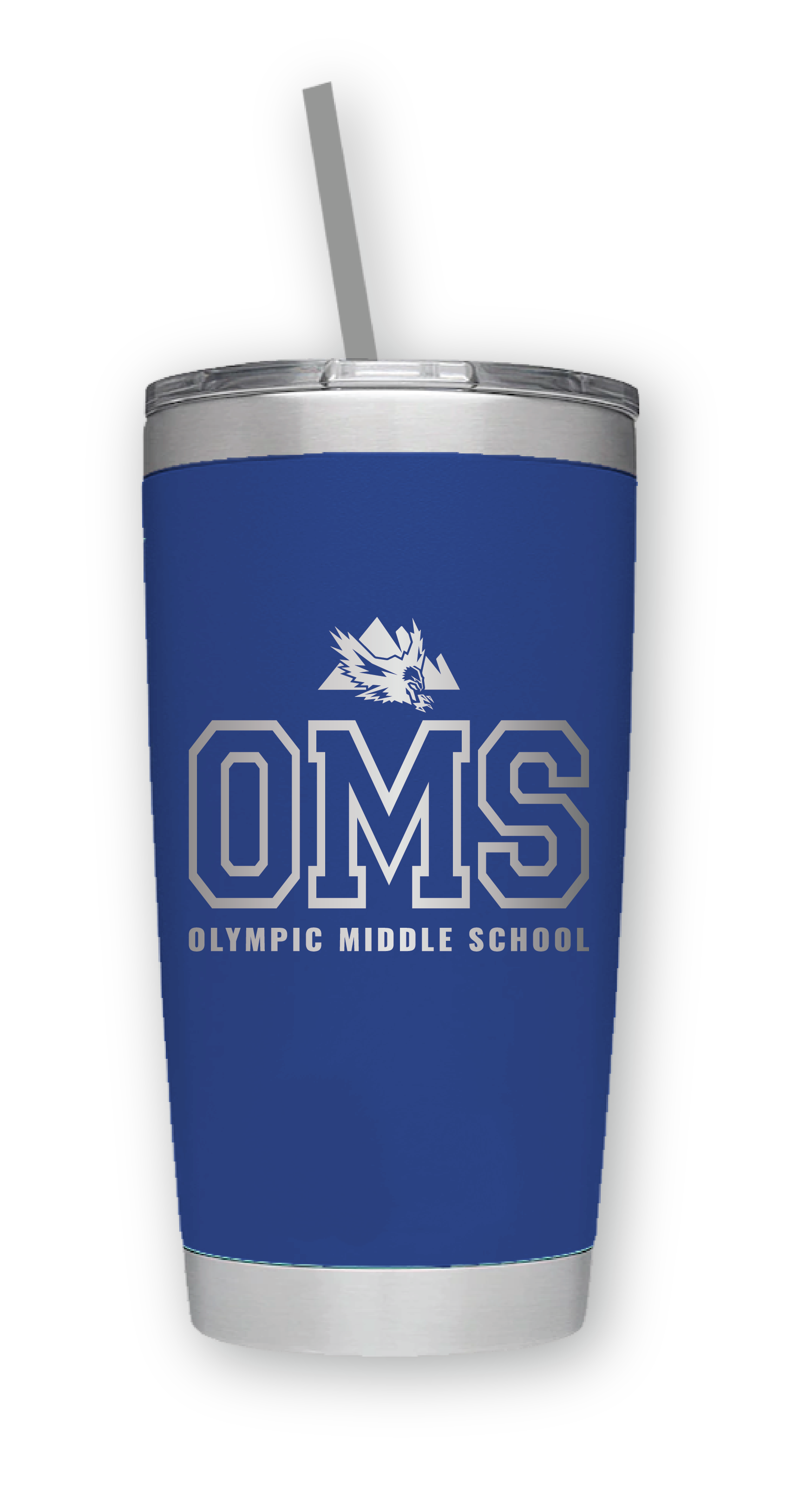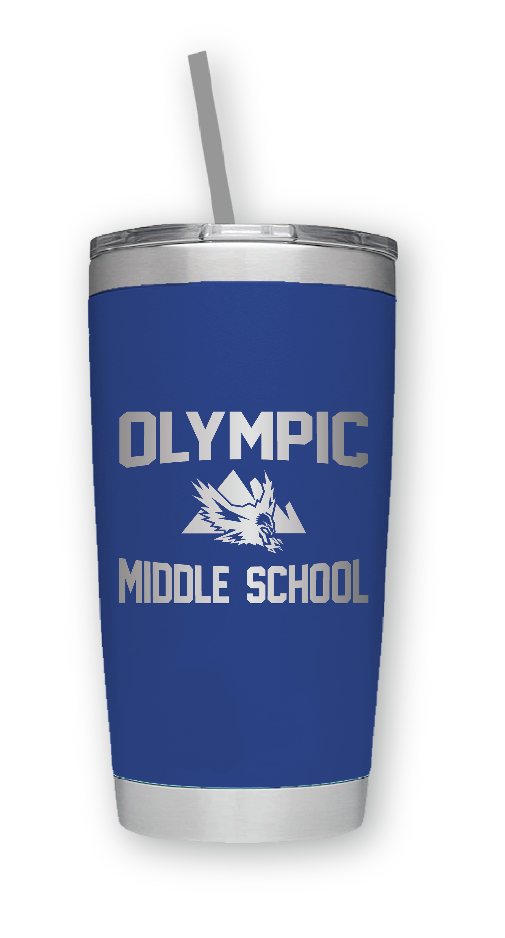 This 20oz Hot Tumbler with Silver Stainless Straw showcases Olympic Middle School Logo and is Laser Engraved.